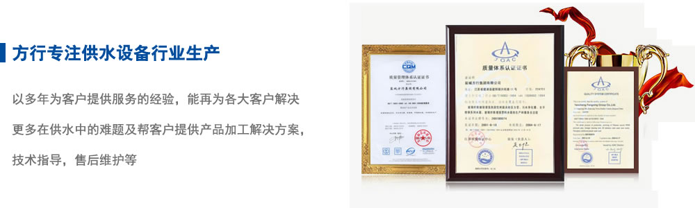 鹽城方行集團有限公司秉承“務實、誠信、拼搏、創(chuàng)新”的企業(yè)精神,經歷了近數十年的歷程取得了跨越式的發(fā)展。高起點才會有更高的品質,優(yōu)雅的環(huán)境,先進的設 備,高效的團隊,造就了一批批優(yōu)質的產品。堅持質量、用戶至上的宗旨,公司全面通過了ISO國際質量體系認證,是制造供水成套設備廠家 之一。經悉心打造,已享有較高的知名度,產品遍布全國,不斷研發(fā)全新產品,滿足消費者的需求 | |
